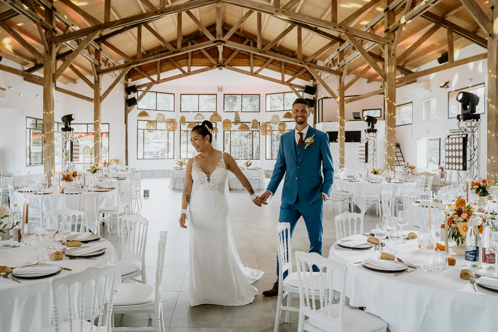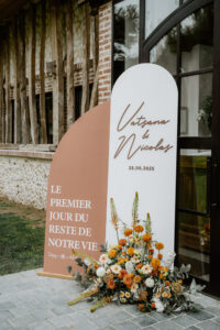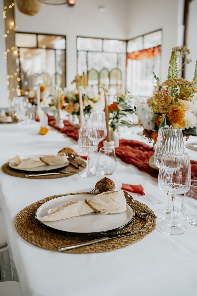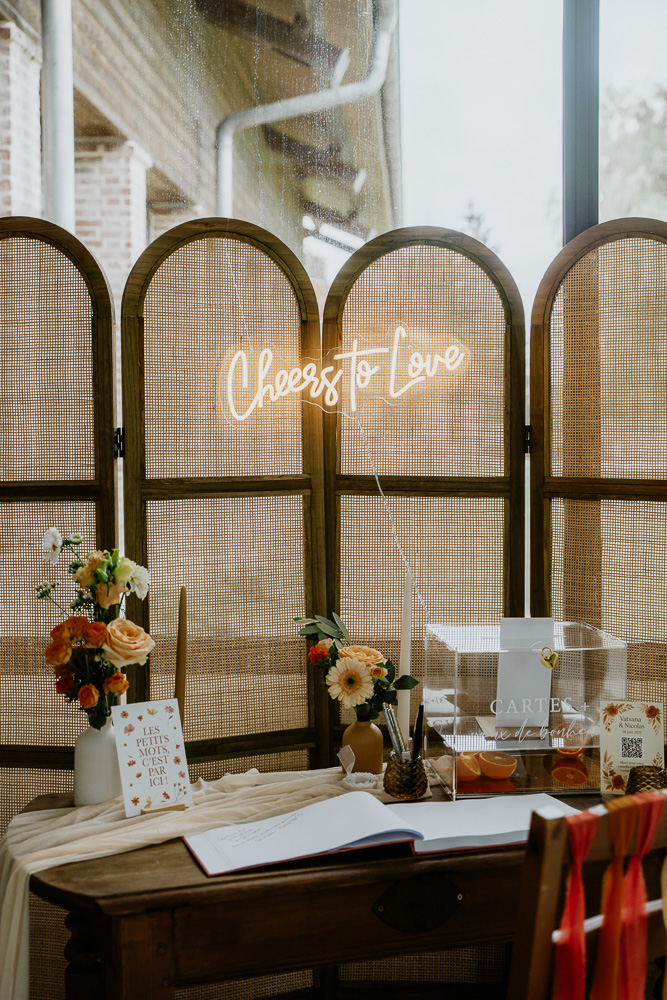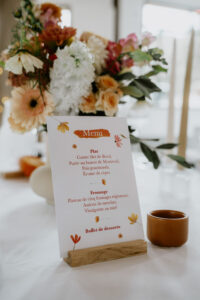 Quant à la décoration, elle a été pensée autour d’une palette de couleurs vibrantes (et orangées !) et de matières naturelles. Elle reflétait parfaitement l’esprit du mariage annoncé dès la réalisation de leur faire-part. Fleurs de saison, touches colorées et lumière dorée ont accompagné cette journée hors du temps.