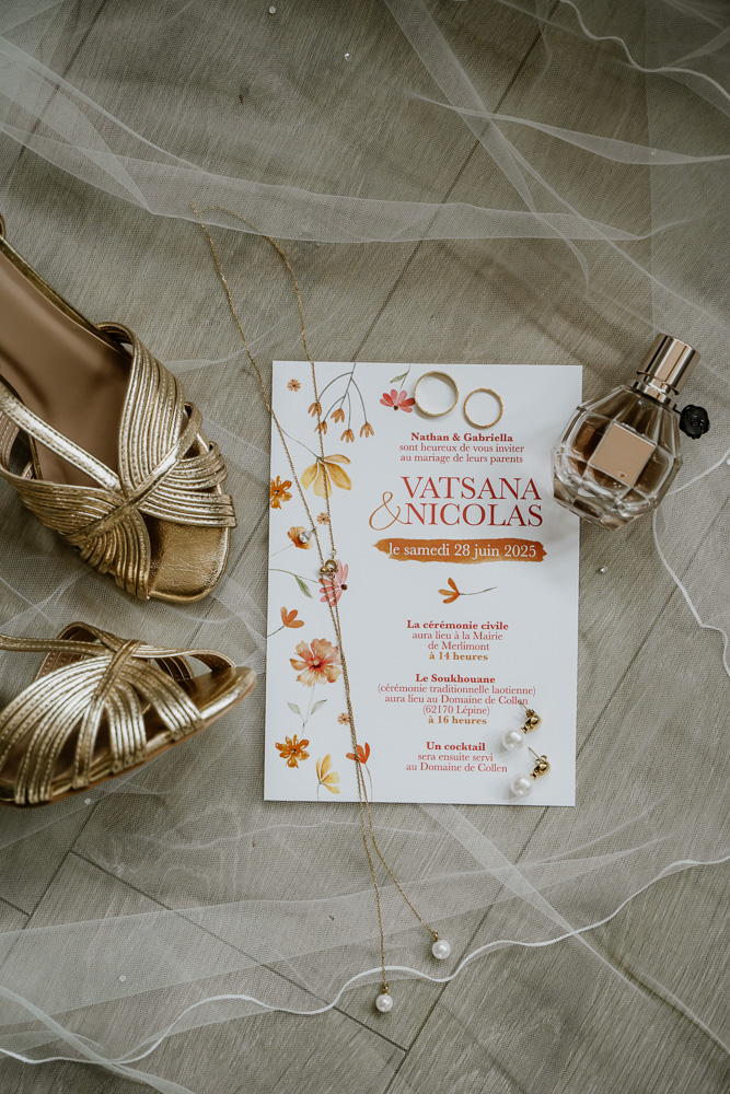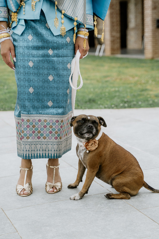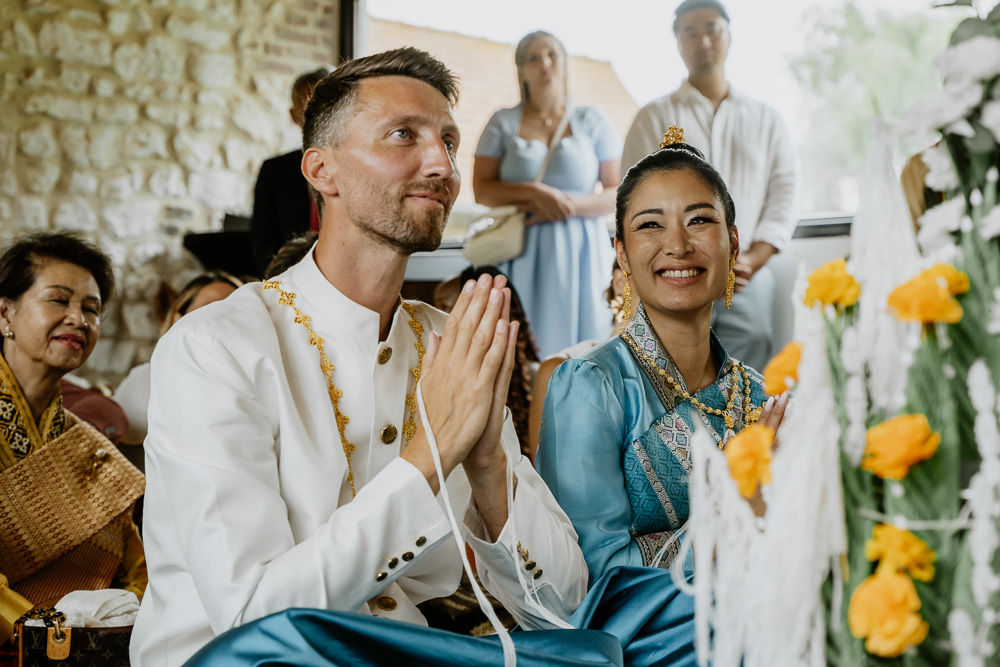 Elle s’est poursuivie par une cérémonie laotienne, profondément symbolique. Chargée de traditions et de sens, elle a apporté une dimension culturelle et spirituelle forte au mariage. Les gestes rituels, les bénédictions et les échanges ont créé une atmosphère douce et respectueuse, offrant aux invités un instant suspendu, empreint d’authenticité et de partage.